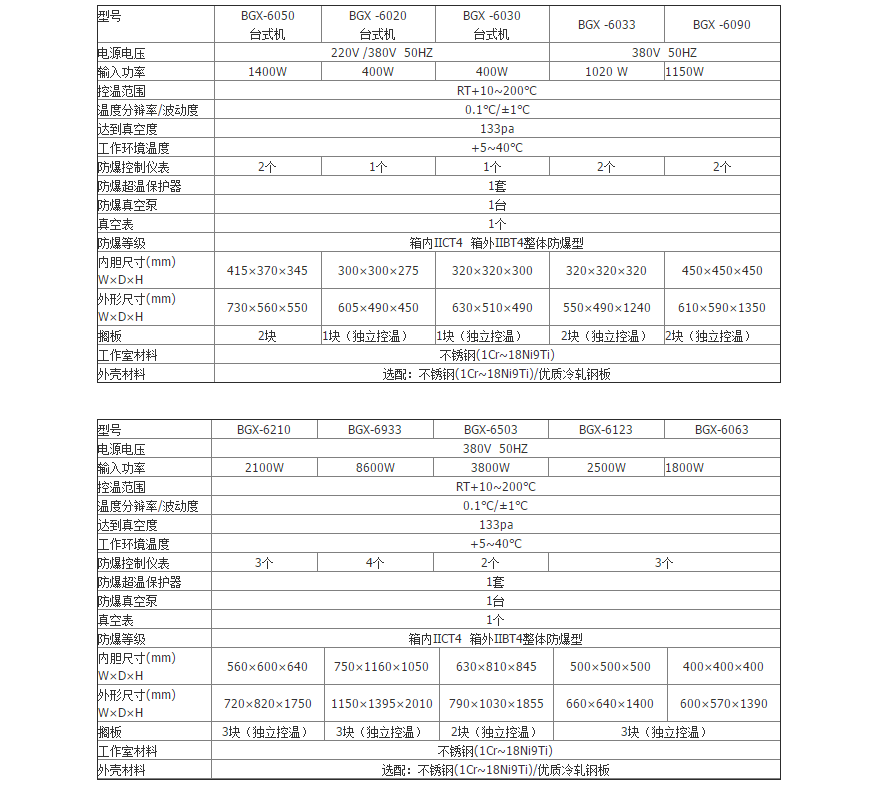 BGX防爆真空干燥箱系列箱体由优质钢板或304不锈钢冲制而成,表面喷塑处理,内胆采用优质304不锈钢板,隔热层采用超细玻璃棉作充填,箱门具有大面积双层钢化玻璃视察窗。